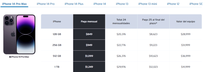 El costo total se va a dividir en 24 mensualidades iguales y una última cuota de pago con un porcentaje aproximado del 18-25% del costo total. Es decir, la cuota número 25 o 37 dependiendo del dispositivo elegido, tendrás que pagar una cuota mayor para cerrar la compra.